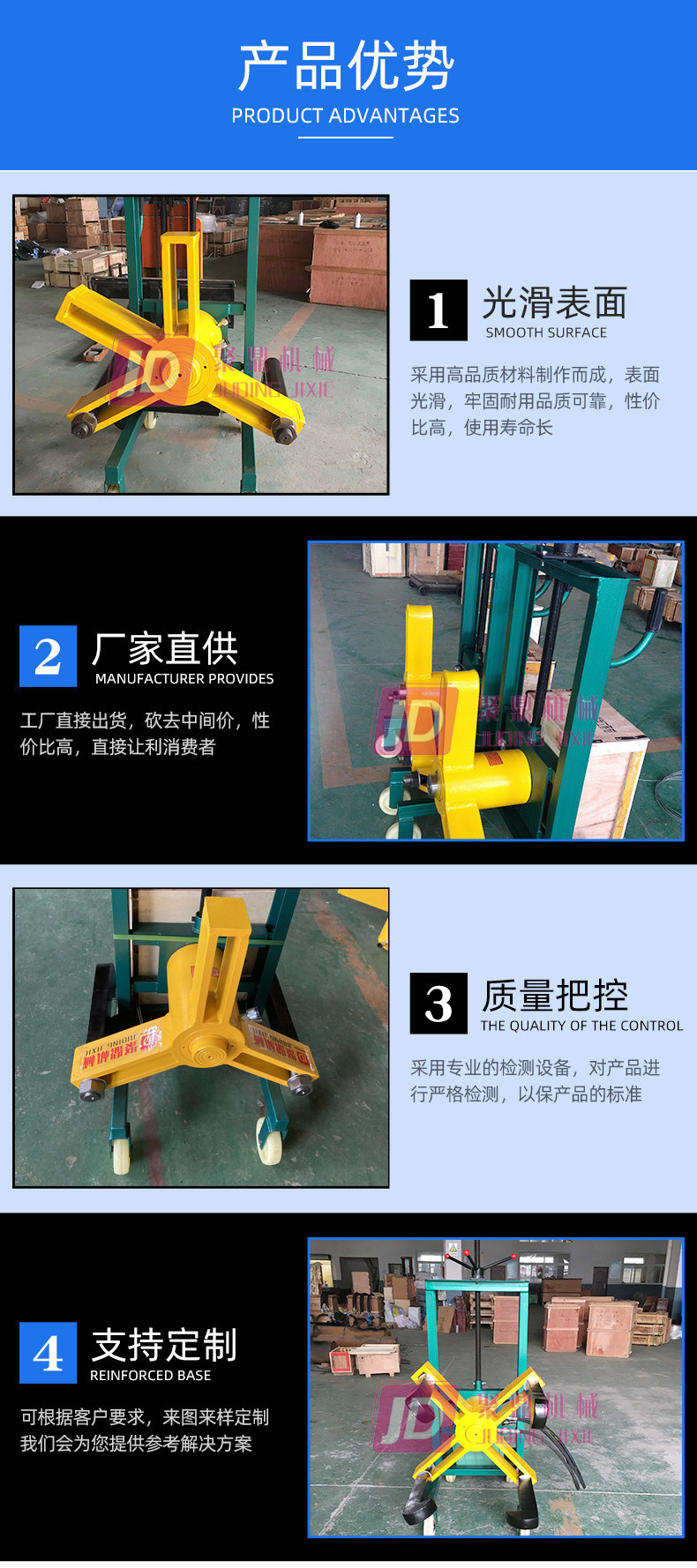 本機系參照裝卸叉車而設計的,底部為四個鋼質萬向輪,經久耐用。